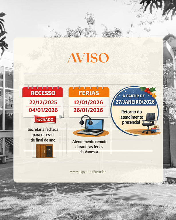 Informamos que entre 22 de dezembro de 2025 e 05 de janeiro de 2026, a secretaria do PPGFil estará fechada devido ao recesso de final de ano.